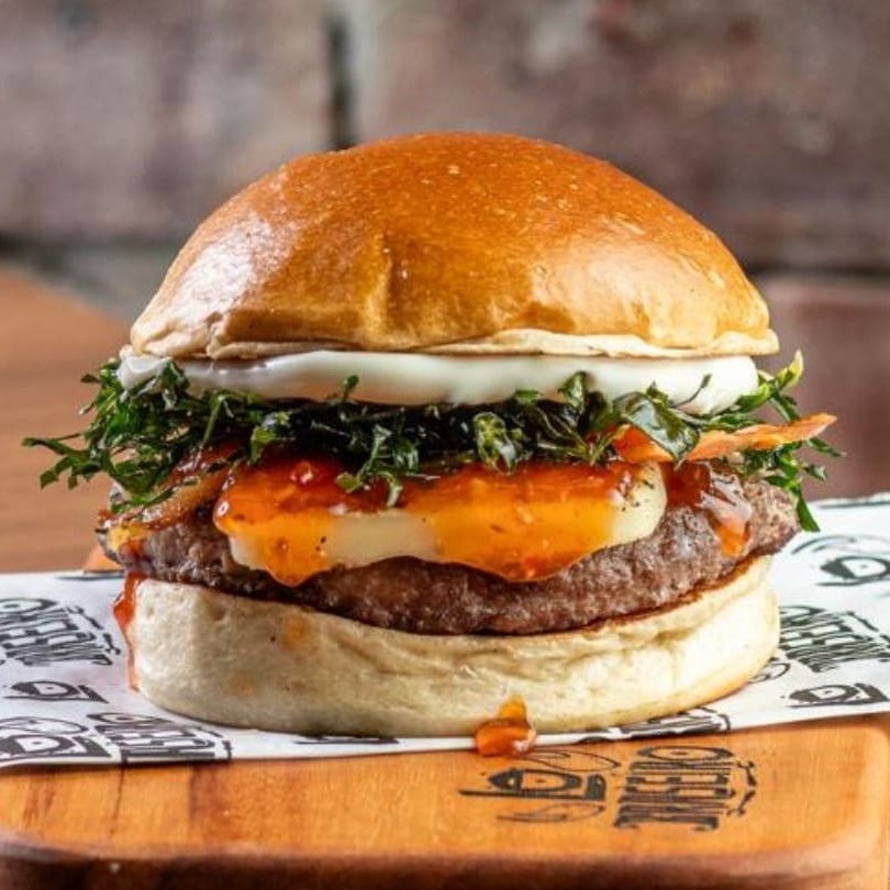 Pãozinho de brioche selado, blend de 160 gramas grelhado do fogo De Verdade, fatia de queijo coalho artesanal, geléia de pimenta agridoce, fatias de bacon defumado, couve crispy e nossa deliciosa maionese defumada.
