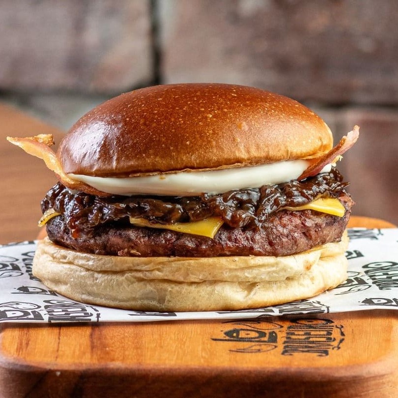 Pão australiano selado, blend de 160 gramas grelhado no fogo, creme de cheddar cremoso feito na casa, cebola caramelizada, fatias de bacon defumado e nossa deliciosa maionese defumada.