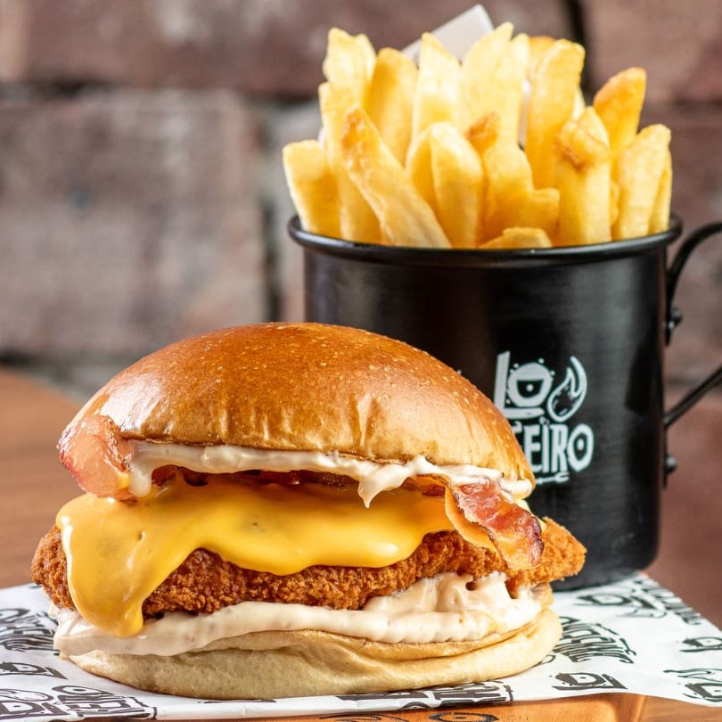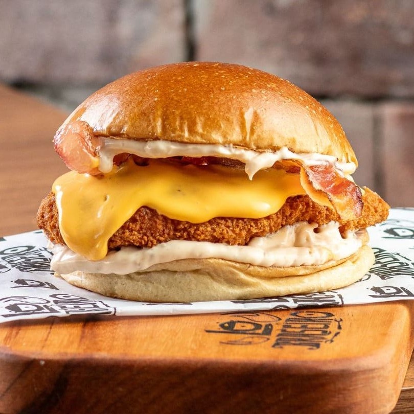 Pão de brioche selado, tiras de frango empanado, cheddar cremoso feito na casa, fatias de bacon defumado e nossa deliciosa baconese.