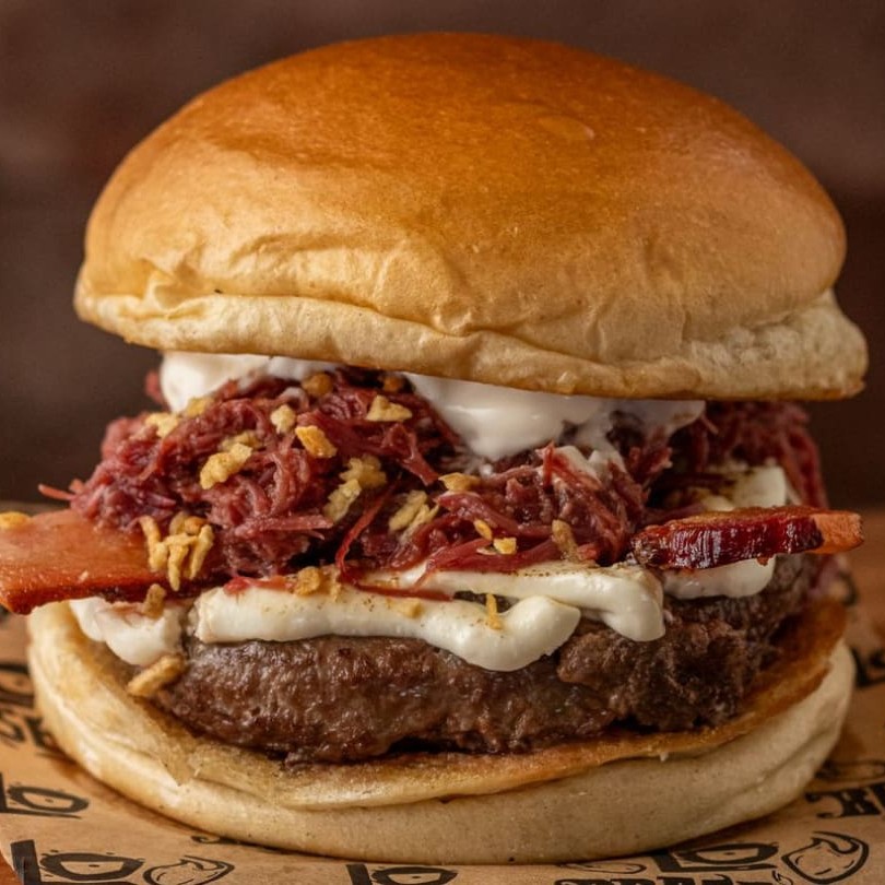 Pãozinho de batata selado na chapa, blend de 160 gramas grelhado no fogo, Catupiry Original maçaricado, carne seca desfiada e suculenta salpicada com crispy de alho, fatias de bacon defumado e maionese defumada.