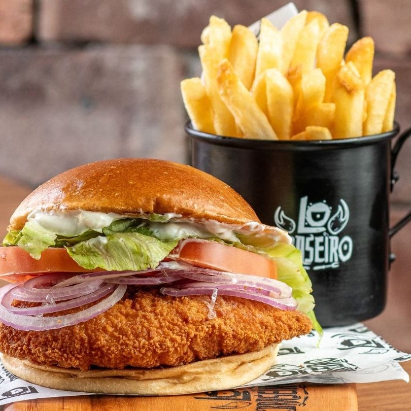 Pão de brioche selado, tiras de frango empanado, tomate, alface americana, cebola roxa e nossa queridinha maionese defumada.