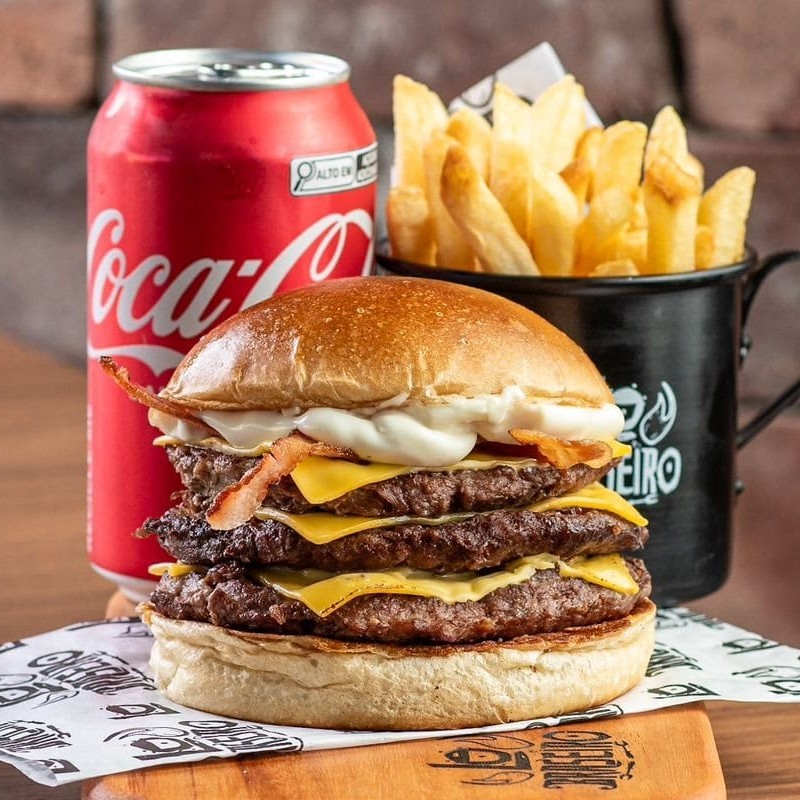 Pão de brioche selado, 3 blends de 100 gramas grelhado no fogo, triplo queijo prato, fatias de bacon e nossa deliciosa maionese defumada Acompanha Fritas + Refrigerante Coca Cola 350ml