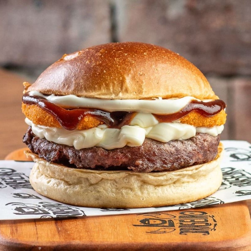 Pão de brioche selado, 1 blend de 160 gramas grelhado no fogo, queijo gouda cremoso empanado, onion rings, fatias de bacon defumado, Bbq e nossa deliciosa maionese defumada.