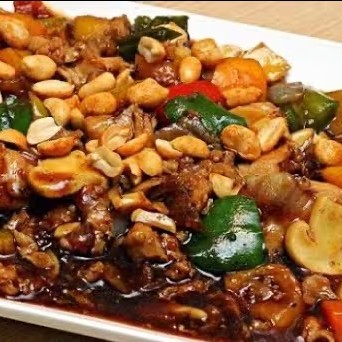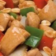 Cubos de frango, cebola, cenoura, champignon, broto de bambú, molho shoyu com missô, finalizado com amendoim torrado.