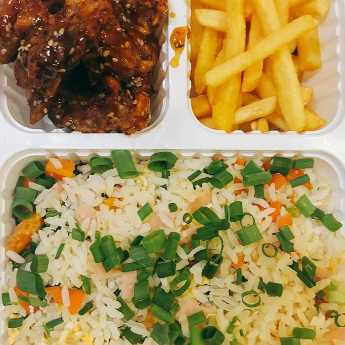 Filé de frango em cubos, cenoura, cebola e pimentão. Acompanha arroz e batata frita.