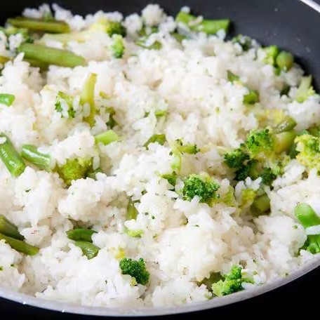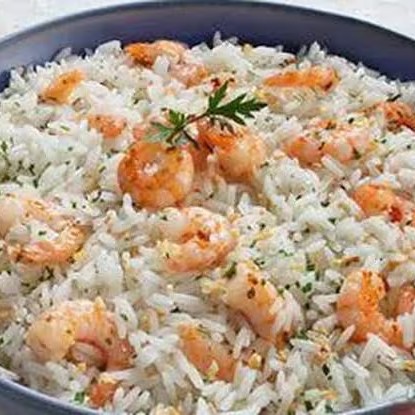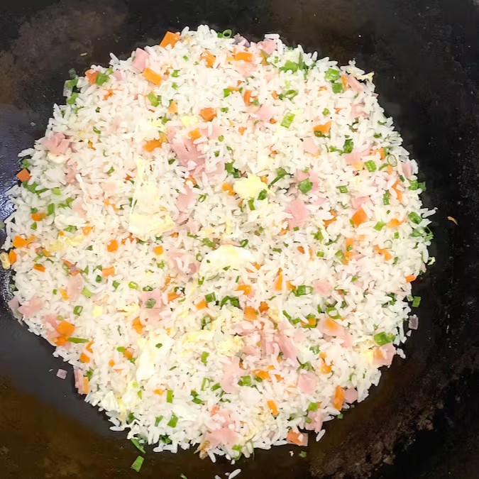 Arroz, ovos, cenoura, presunto, camarão e cebolinha.