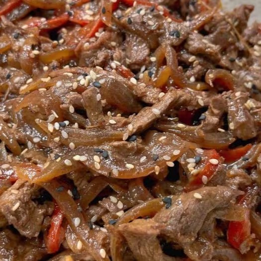 Carne desfiada com cebolas ao molho shoyu. Atenção: não retiramos ingredientes do prato.