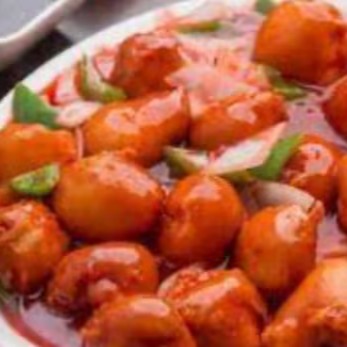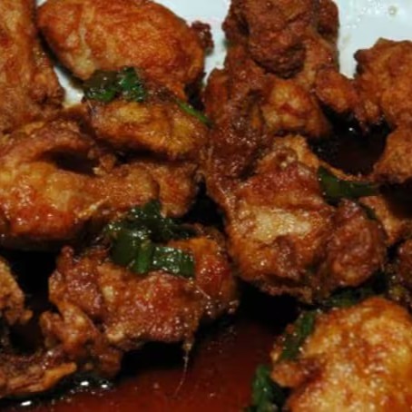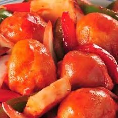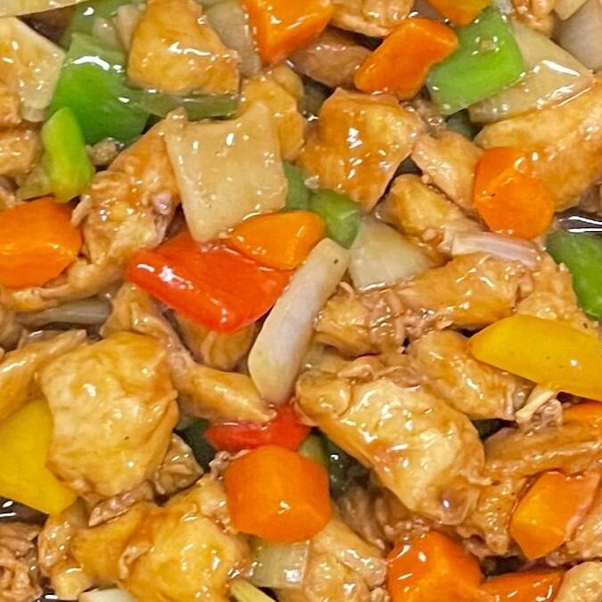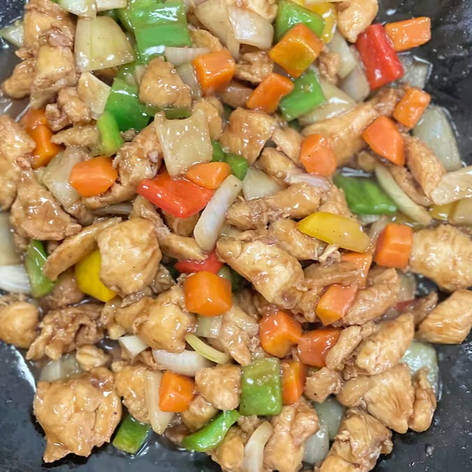Frango empanado em cubos, cebola, pimentão, abacaxi e molho agridoce. Atenção: não retiramos ingredientes do prato.