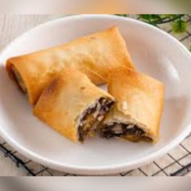 Massa fina recheada com banana e chocolate. Coberta com canela e açúcar.