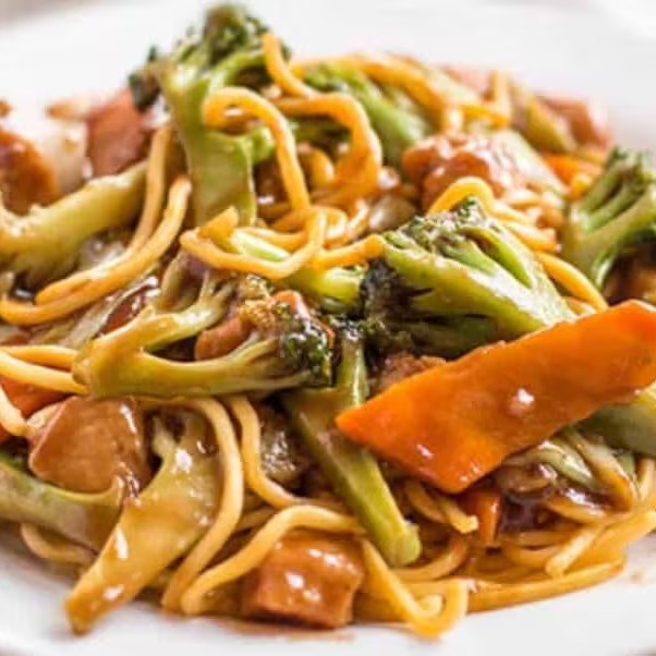 Macarrão frito, frango, brócolis, cebola, pimentão, cenoura, cogumelos e repolho.
