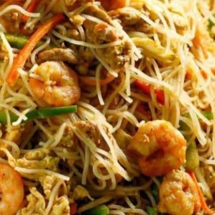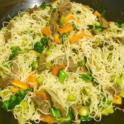 Bifum (macarrão de arroz), carne, cenoura, presunto, cebolinha e molho shoyu.