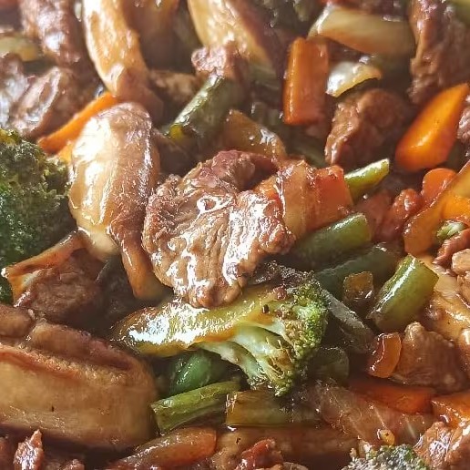 Carne fatiada, cenoura, cebola, pimentão, repolho, brócolis e molho shoyu.