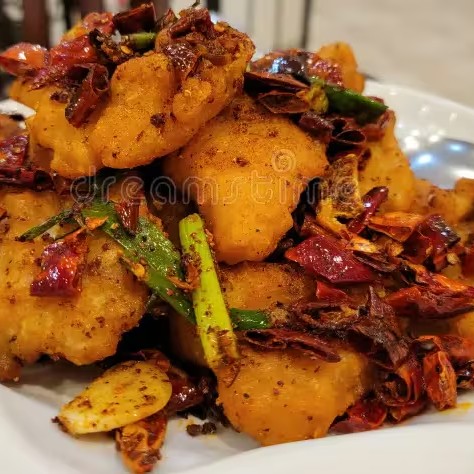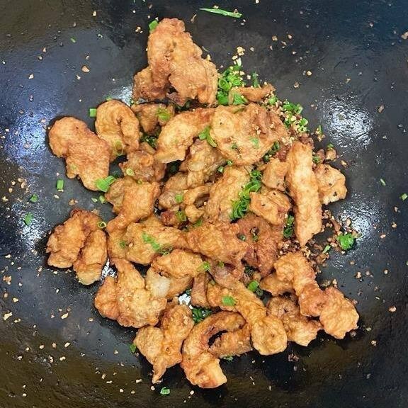 Tiras de lombo fritas com alho e cebolinha, cobertas com nosso molho de mel e sementes de gergelim. Acompanha arroz e batatas fritas.