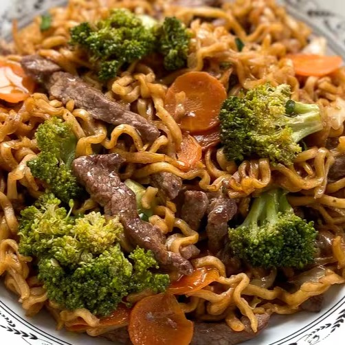 Macarrão frito, carne fatiada, brócolis, cebola, pimentão, cenoura, cogumelos e repolho.