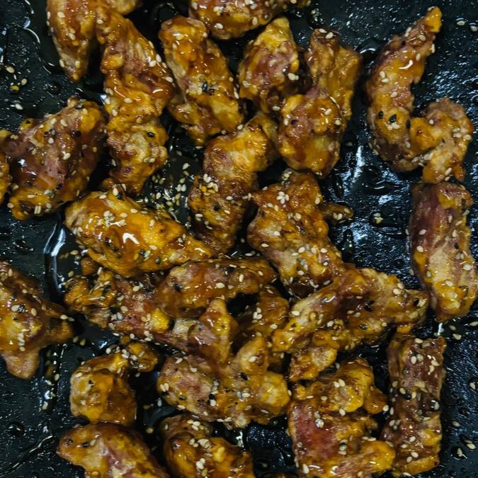 Tiras de lombo fritas com alho e cebolinha, cobertas com nosso molho de mel e sementes de gergelim.