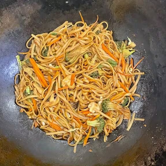 Macarrão frito, brócolis, cebola, pimentão, cenoura, cogumelos e repolho.