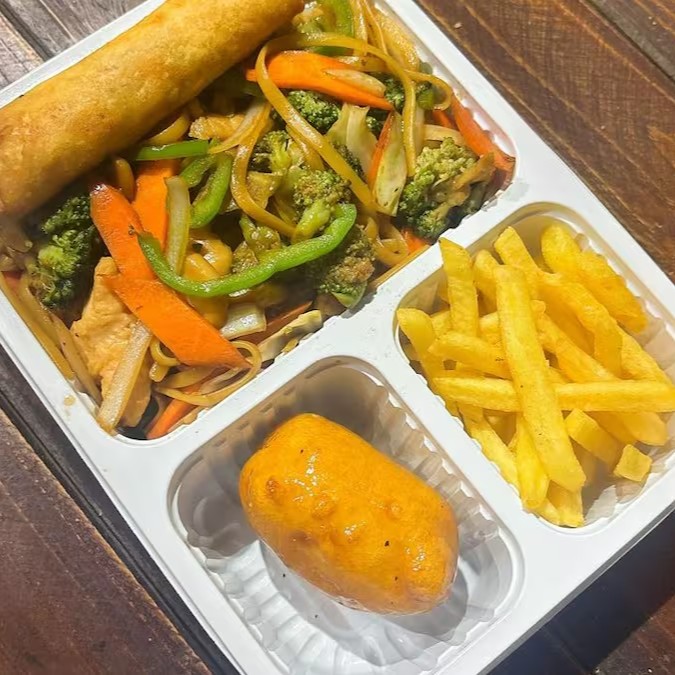 Nossa exclusiva combinação para uma refeição completa em um único prato. Entrada 1 rolinho + Batata frita + Prato principal Yakisoba + sobremesa 1 banana caramelada + Coca Cola 220ml