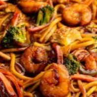 Macarrão frito, camarão, brócolis, cebola, pimentão, cenoura, cogumelos e repolho.