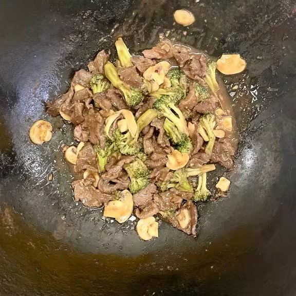 Carne fatiada, brócolis e champignons ao molho shoyu.