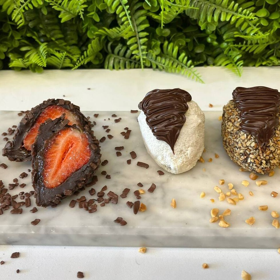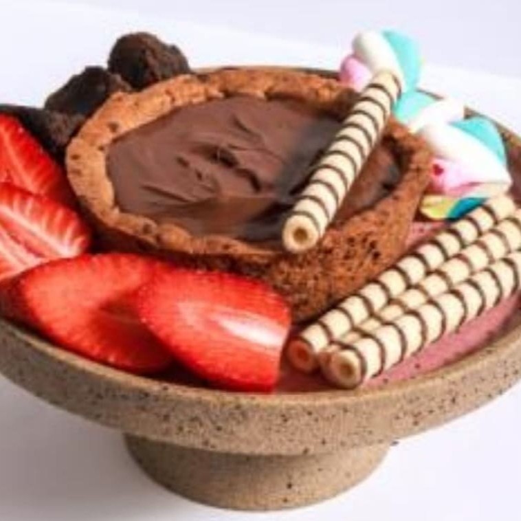 Deliciosa sobremesa com formato de Founde, acompanhado com uma tigelinha comestível de Cookie, pedaços de Brownie, Morangos frescos, marshmallow e canudinhos.