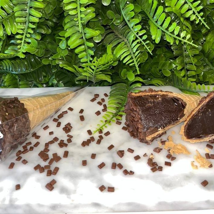 Cone de casquinha com recheio de Ninho e creme de avelã.