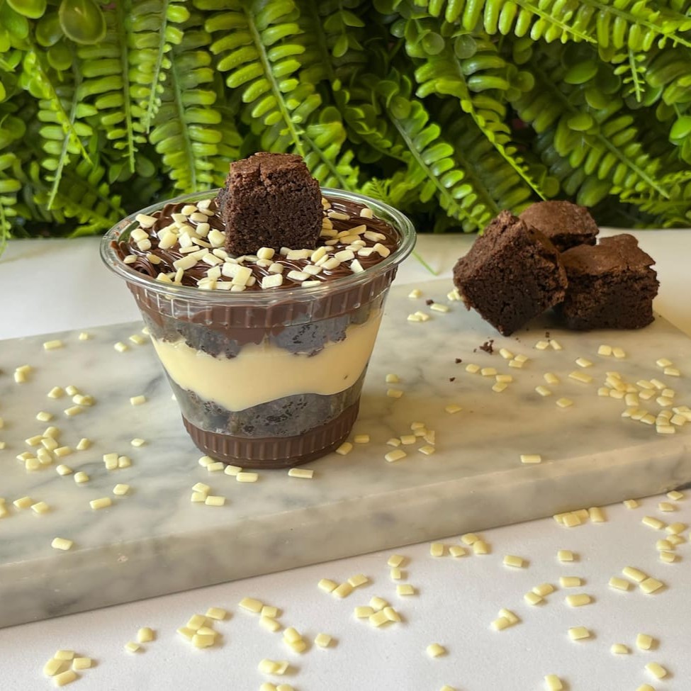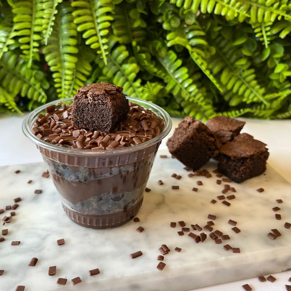 Delicioso pote de brownie com chocolate , Ninho e acabamento de creme de avelã.