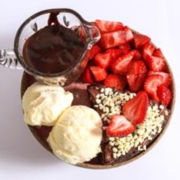 Deliciosa sobremesa acompanhada com duas bolas de sorvete de creme, fatia de Brownie, Morangos frescos e calda de chocolate 50% cacau quente.