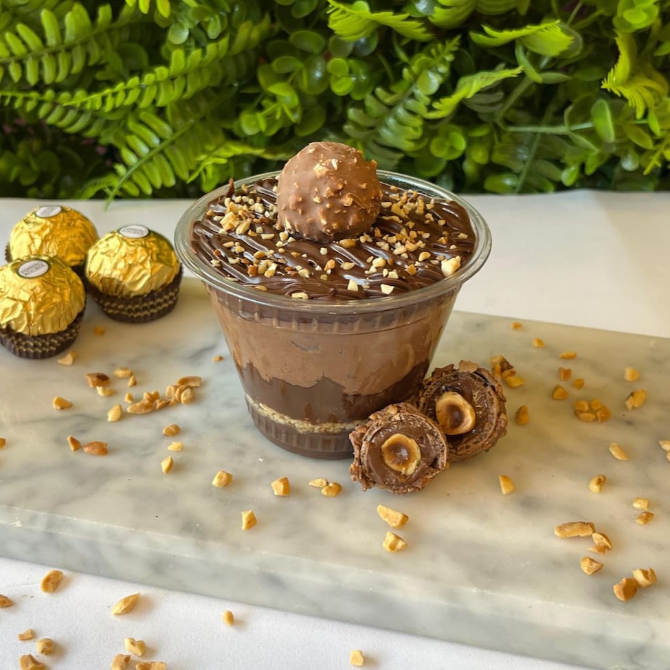 Delicioso pote de Mousse de chocolate ,castanha de caju, creme de avelã e um bombom de Ferrero Rocher.