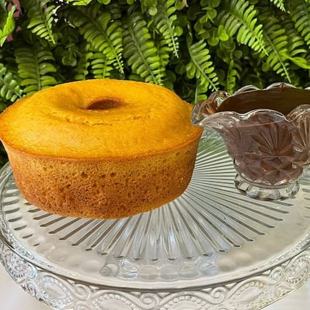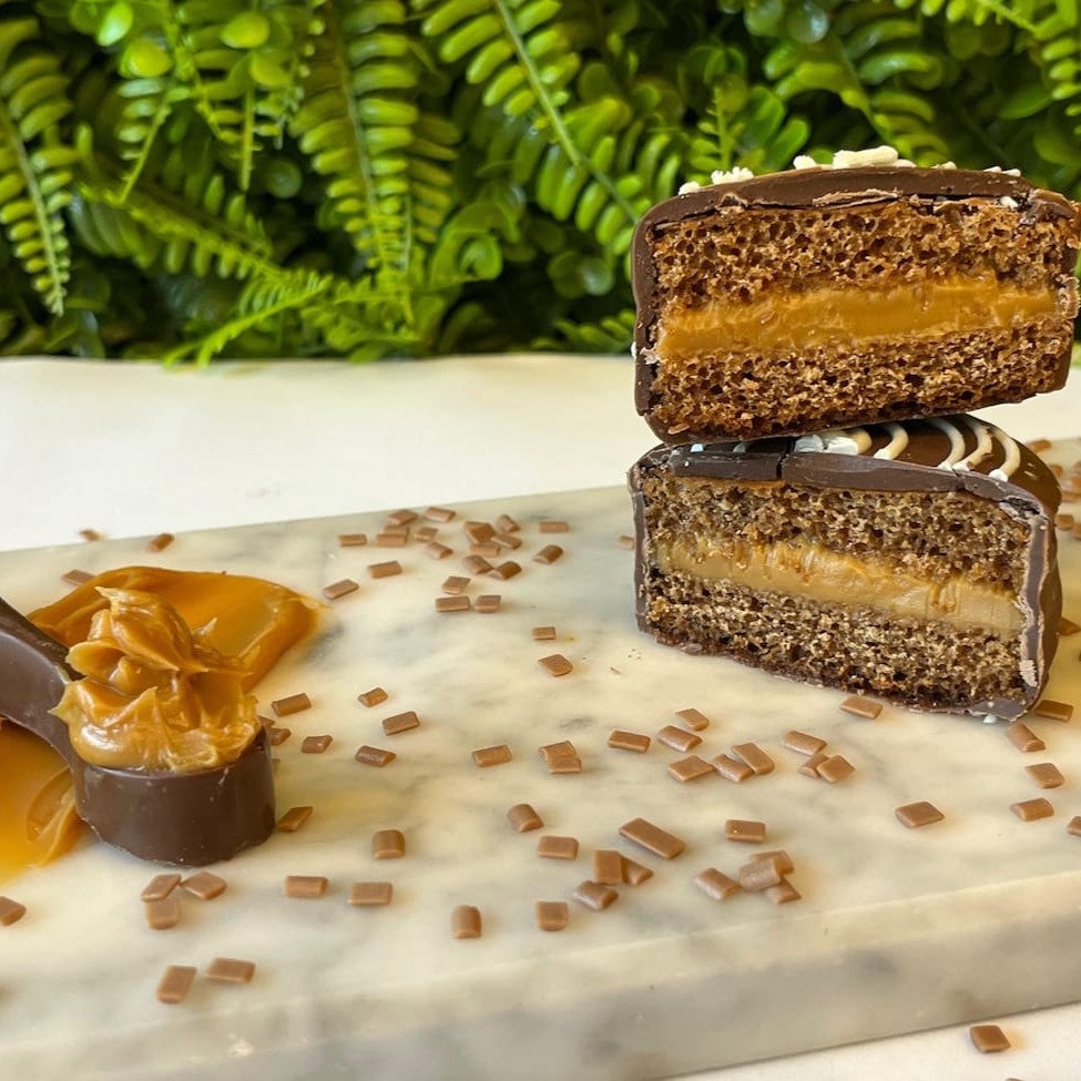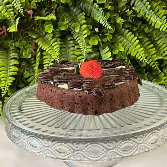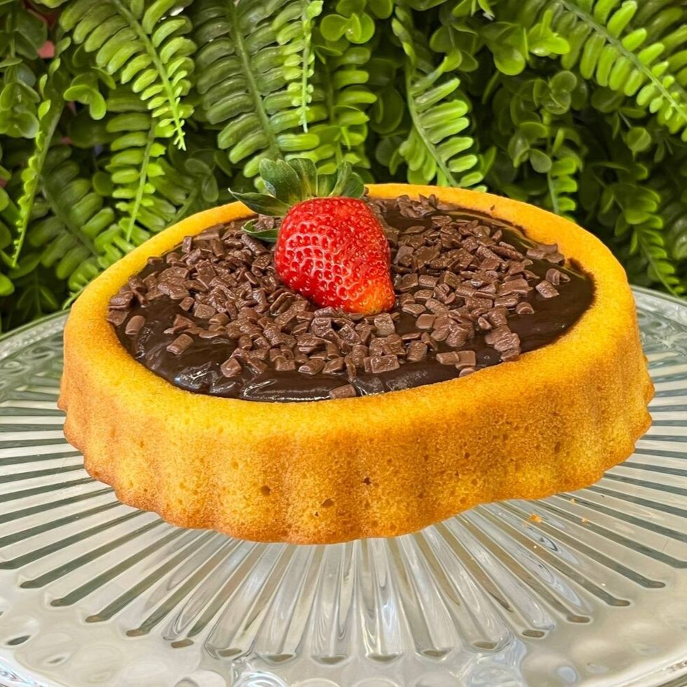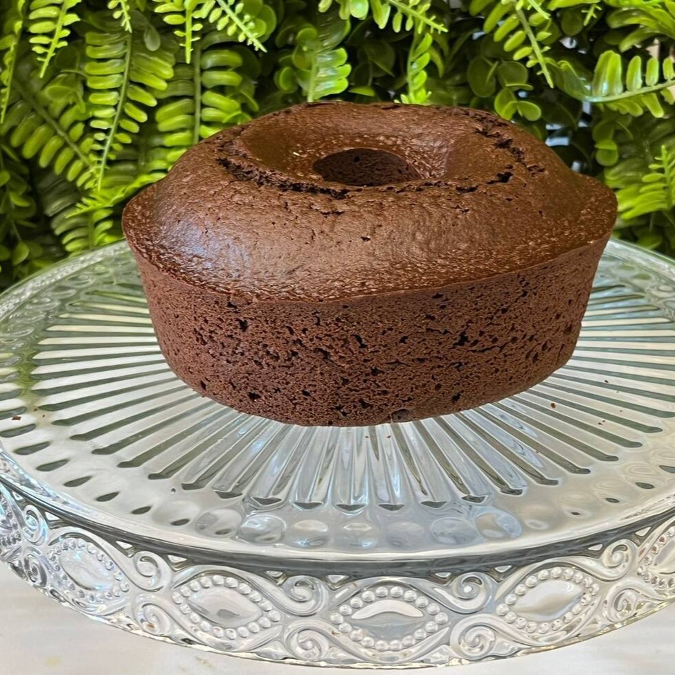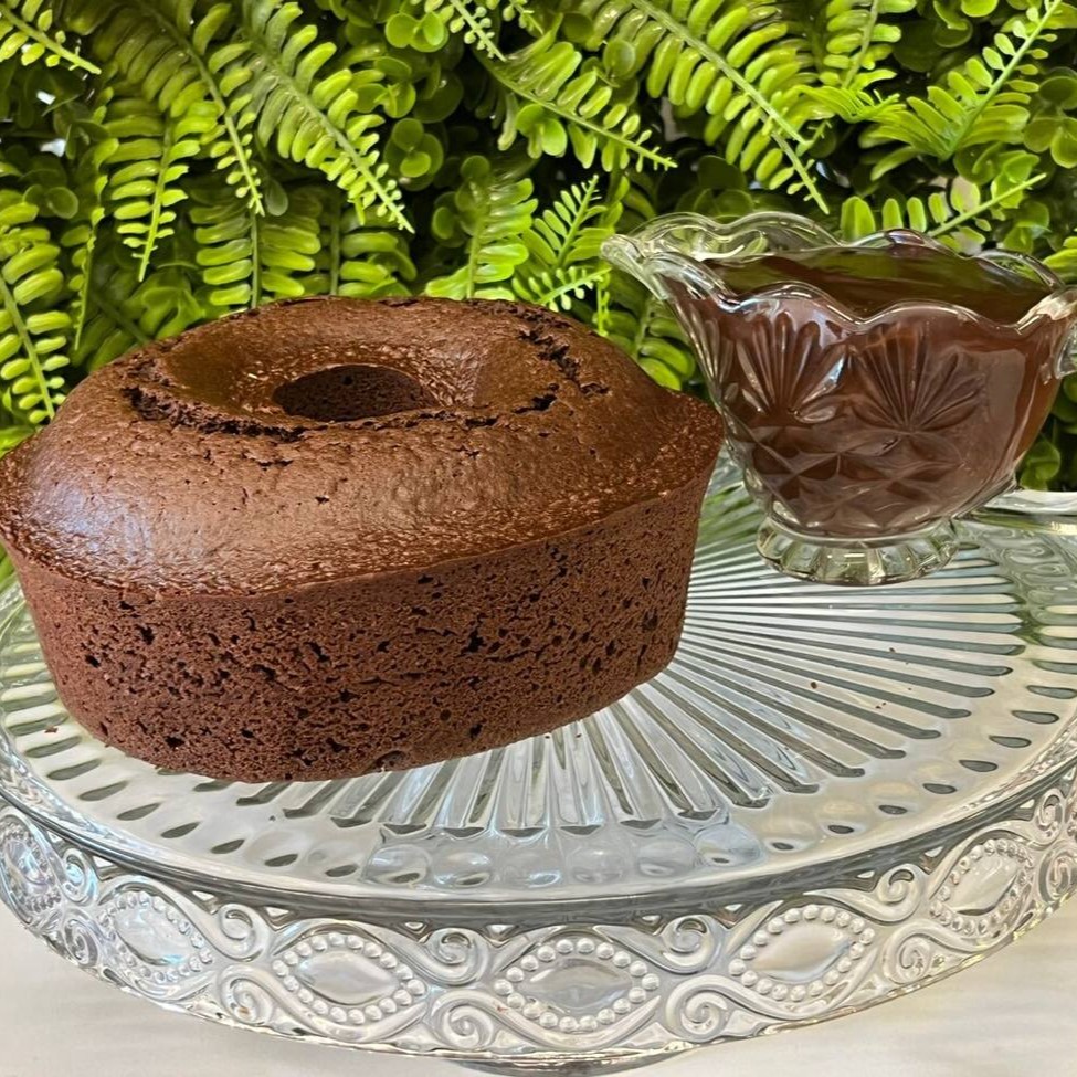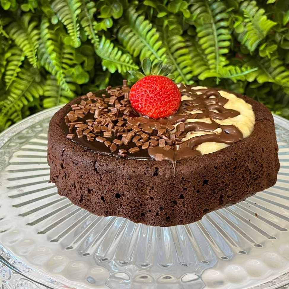 Bolo de chocolate acompanhado com 500ml de uma deliciosa calda de chocolate 50% cacau.