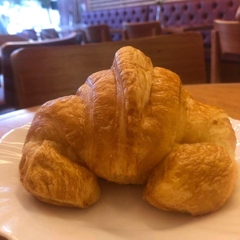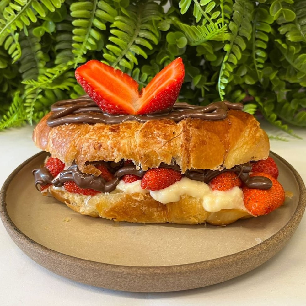 Delicioso croissant amanteigado,com recheio de creme de Ninho, com morango e acabamento de creme de avela.