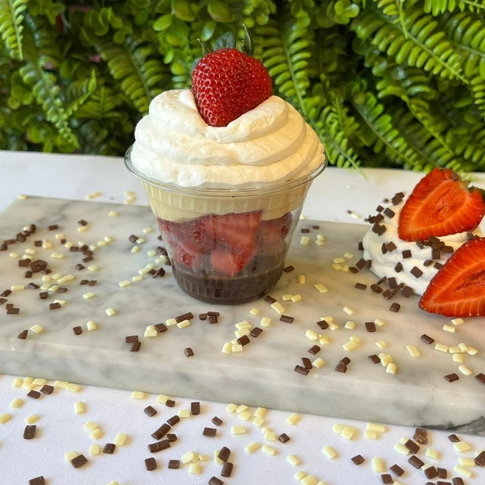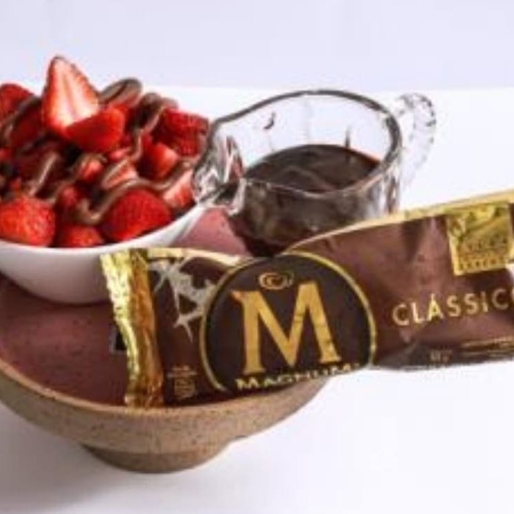 Deliciosa sobremesa acompanhado com Brownie, chocolate, morango com acabamento de creme de avelã e um picolé Magnum Tradicional.