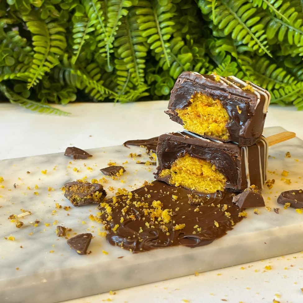 Picolé de bolo de cenoura com brigadeiro gourmet e laçado no chocolate 50% cacau.