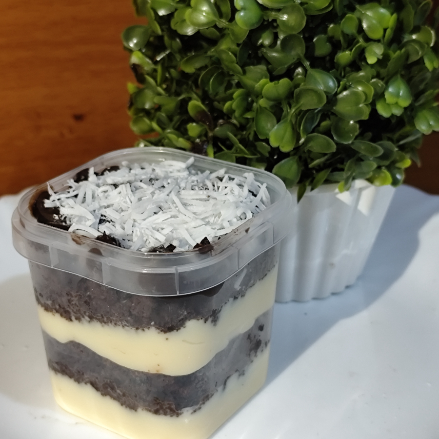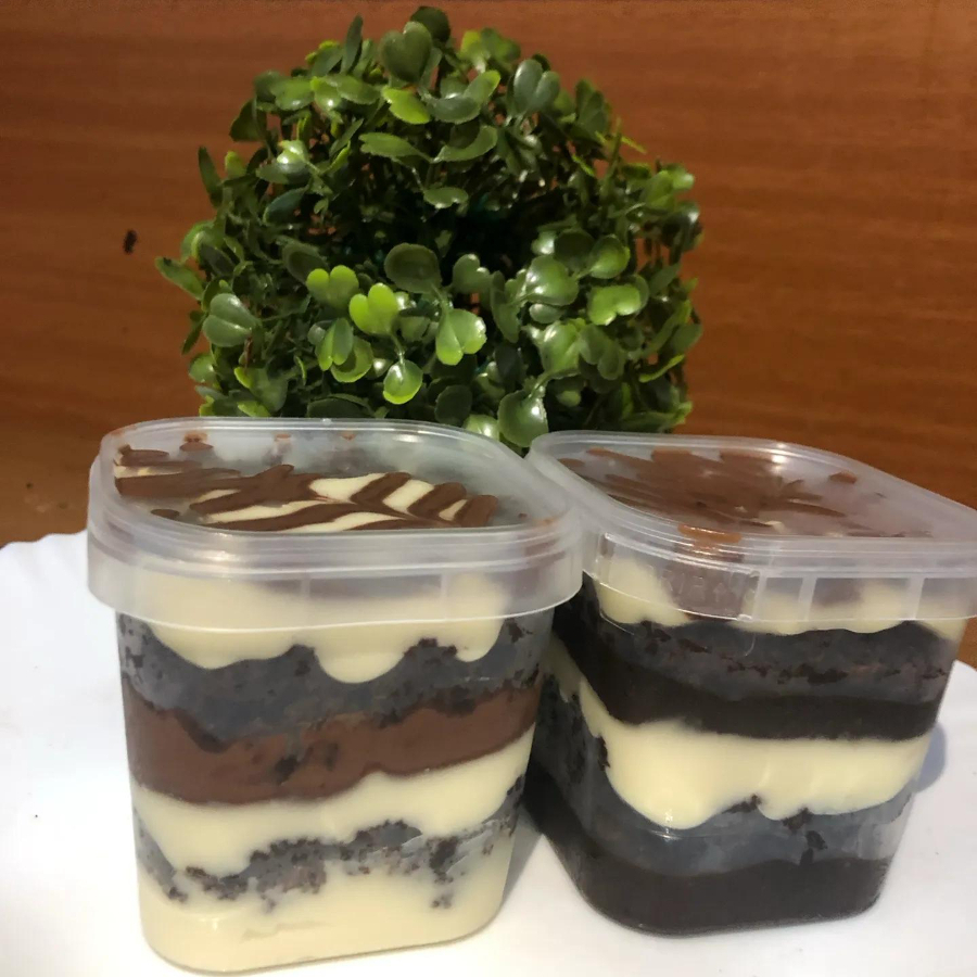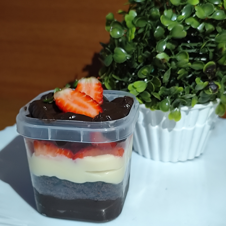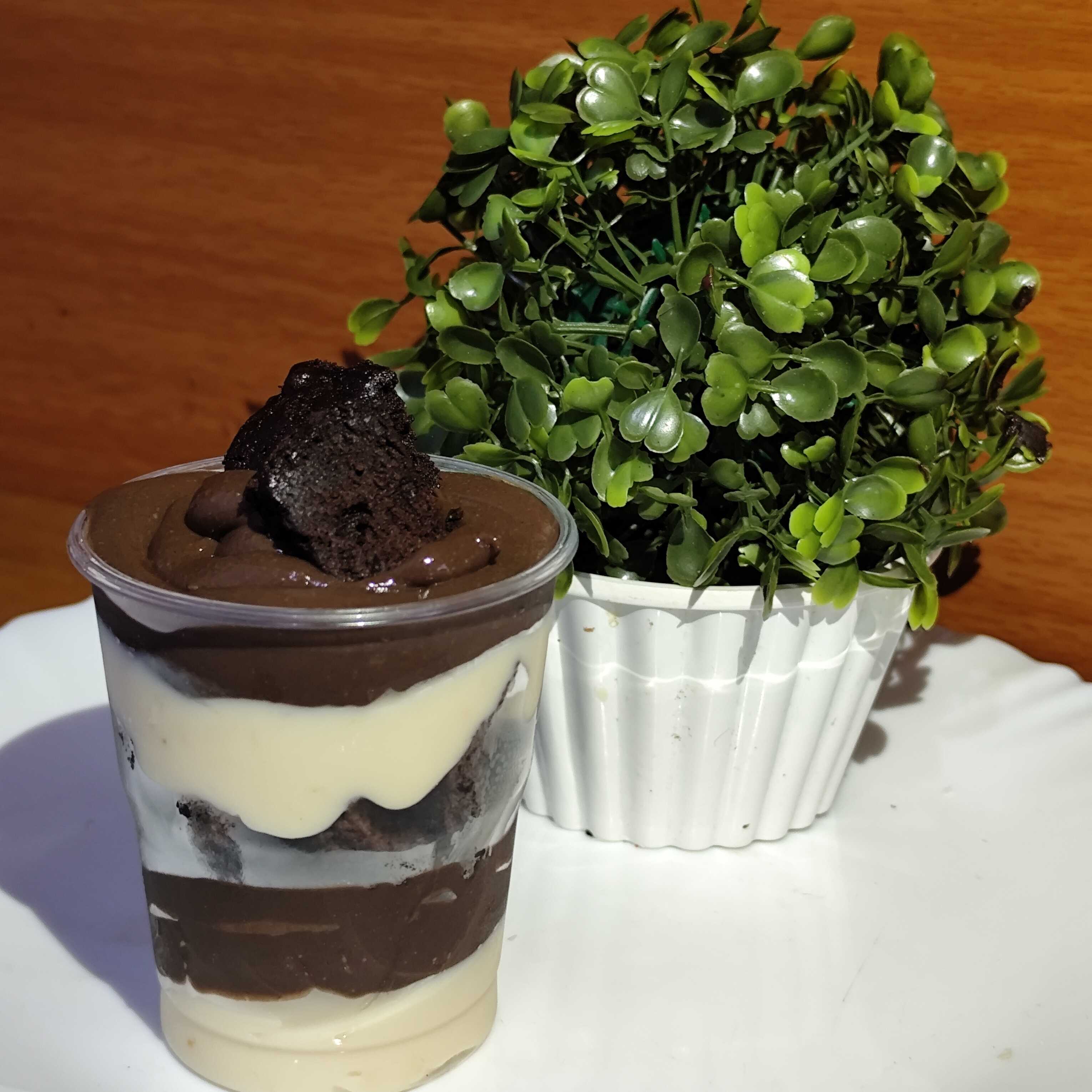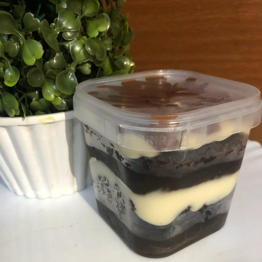 Camadas de creme de Ninho, brigadeiro de cacau 100% e pedaços de brownie, formando a combinação perfeita de dois cremes com o bolo bem molhadinho e chocolatudo