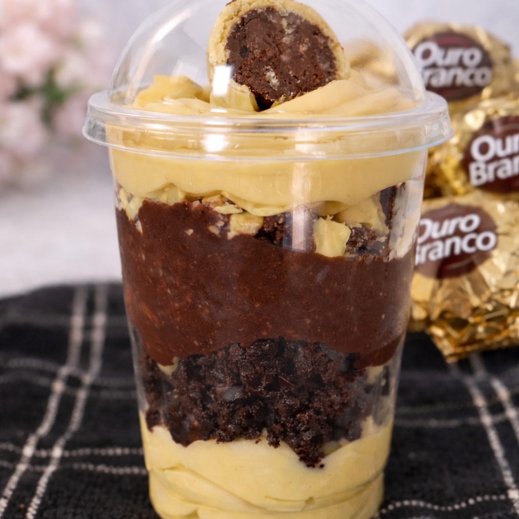 Nosso Copo Ouro Branco é feito com camadas de brigadeiro de Ninho super cremoso, bolo tipo brownie bem molhadinho, uma camada de brigadeiro de cacau 100% e bombom Ouro Branco triturado. Uma sobremesa intensa, cremosa e cheia de textura a cada colherada.