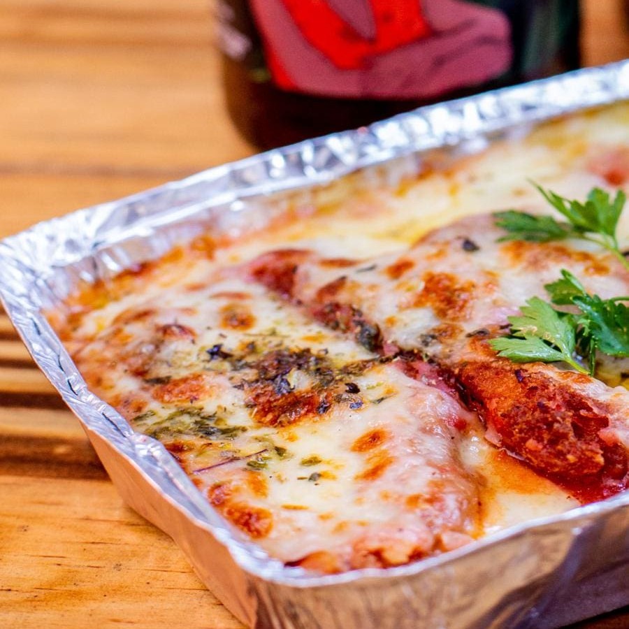 O sensacional bife à parmegiana do Lu&Viola acompanhado de arroz branco, purê de batatas. É pra comer rezando. Escolha entre as opções: frango, lombinho, bovino ou tilápia.