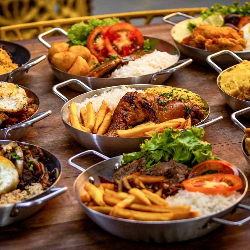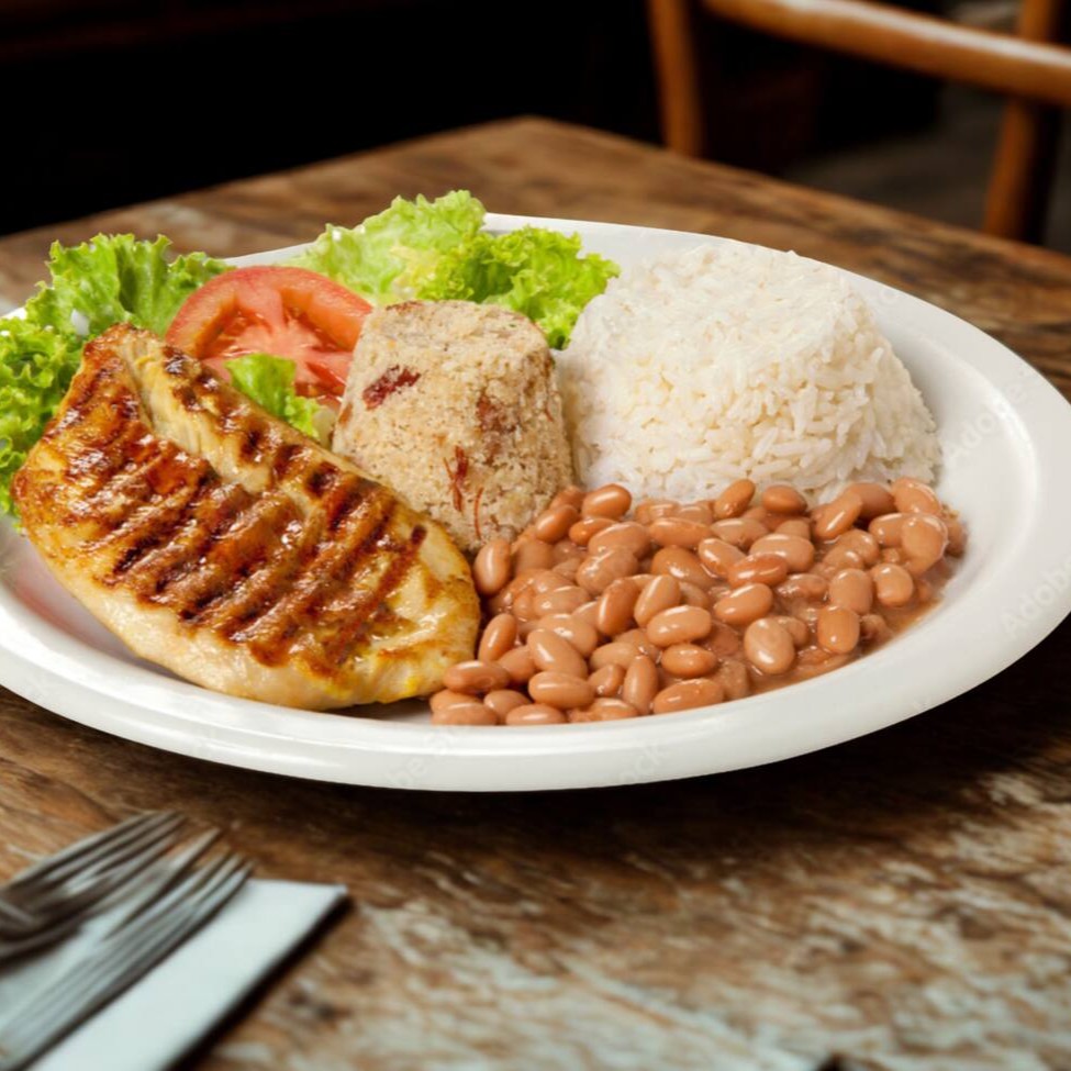 Arroz, feijão, frango grelhado, farofa, salada.