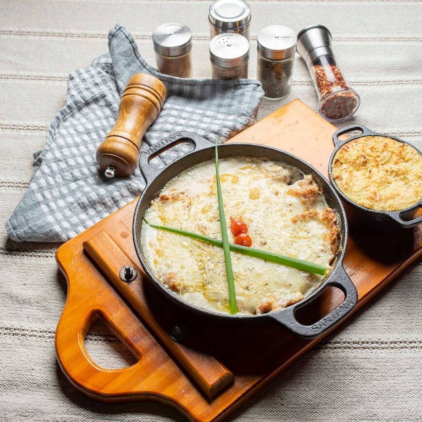 A nossa tilápia gratinada é um sucesso e todo mundo ama. Ela acompanha arroz branco, purê de batatas gratinado, feijão e salada. As guarnições vão separadas e bem caprichadas para uma melhor experiência.