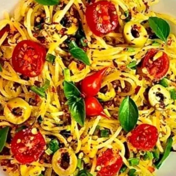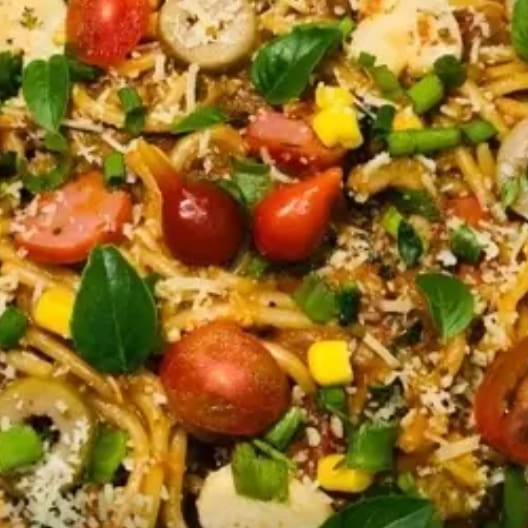 espaguete, molho vermelho, milho, azeitona , cebola, pimentão, manjericão, musarela, cebolinha e oregano