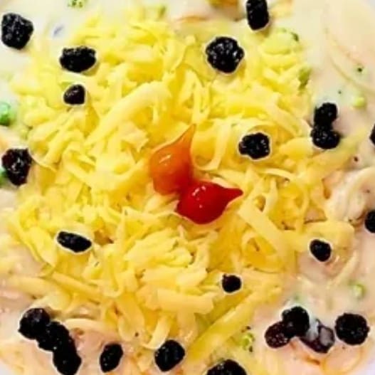 Espaguete, molho branco, uvas passa , calabresa, bacon, azeitona, muçarela, orégano, cebolinha