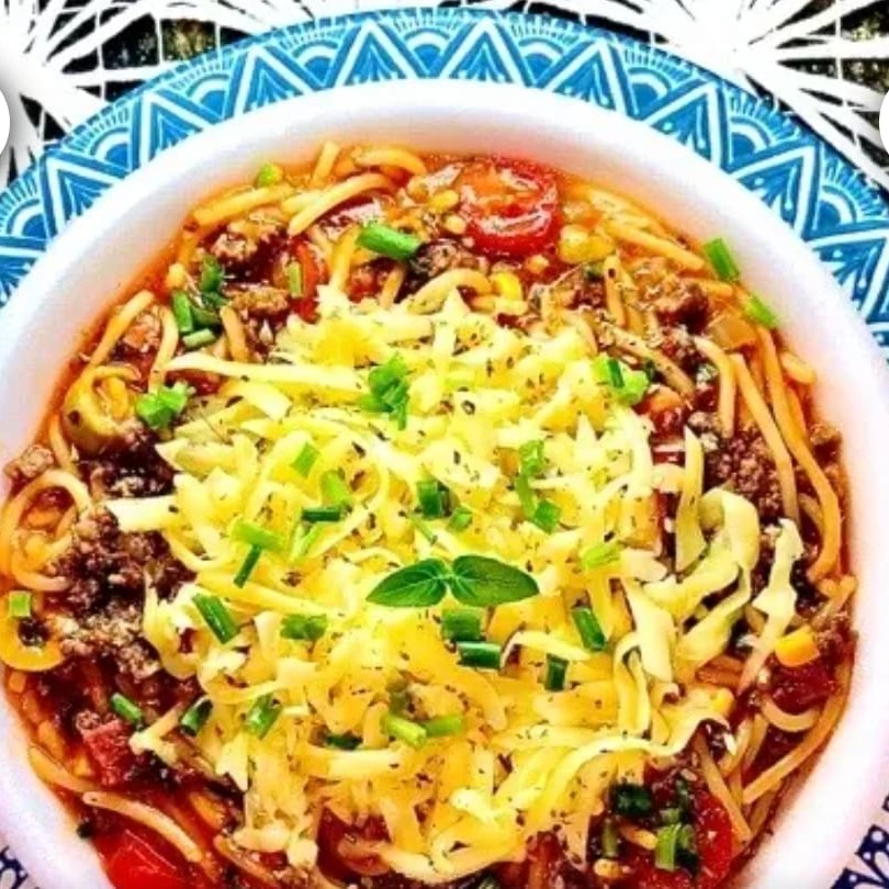 espaguete, carne moida, bacon , calabresa, milho ,azeitona, cebolinha , manjericao e mussarela