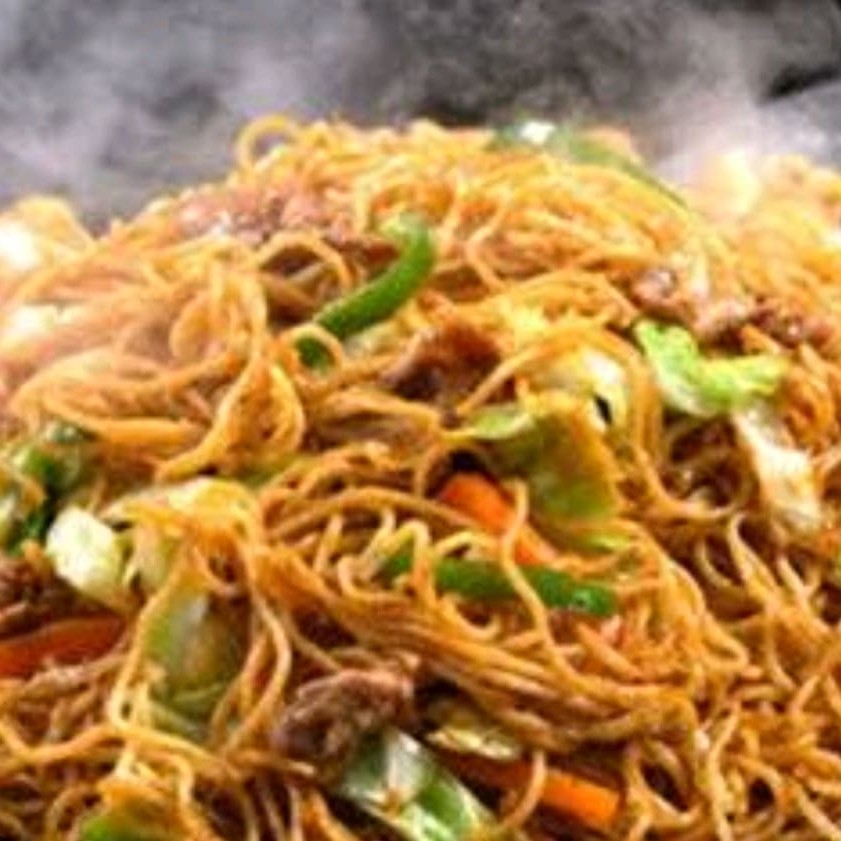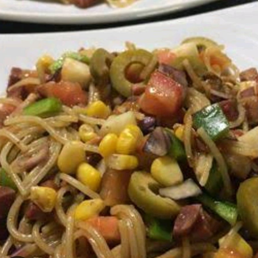 Espaguete, bacon, calabresa, Cebola, pimentão, milho,repolho cebolinha e molho soyo.