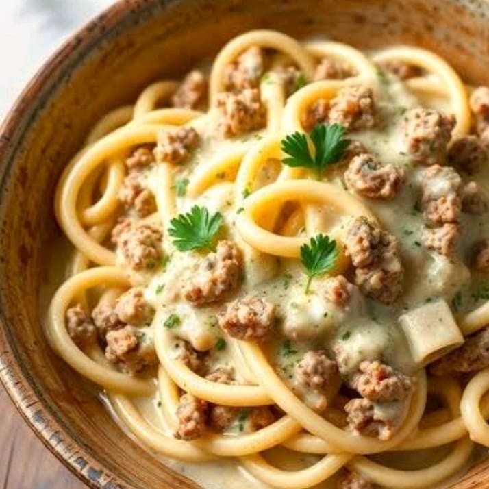 Macarrao Com Carne Moida E Molho Branco