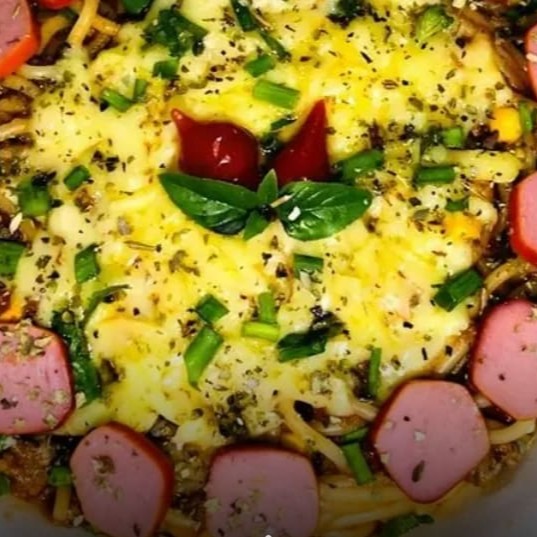Espaguete , molho vermelho, salsicha, bacon, milho ,muçarela, cebolinha,manjericão