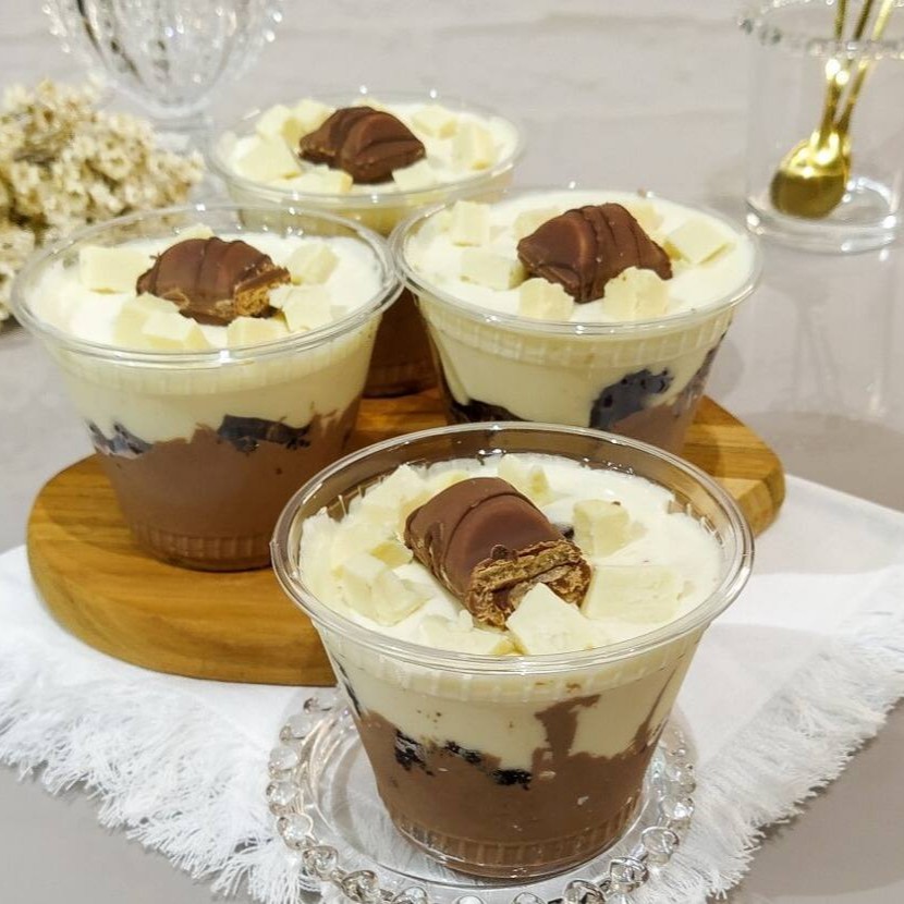 Mousse De Doce De Leite, Pedaços De Brownie, Ganache De Chocolate Meio Amargo, Decorado Com Chantininho E Bombom Twix Picado.