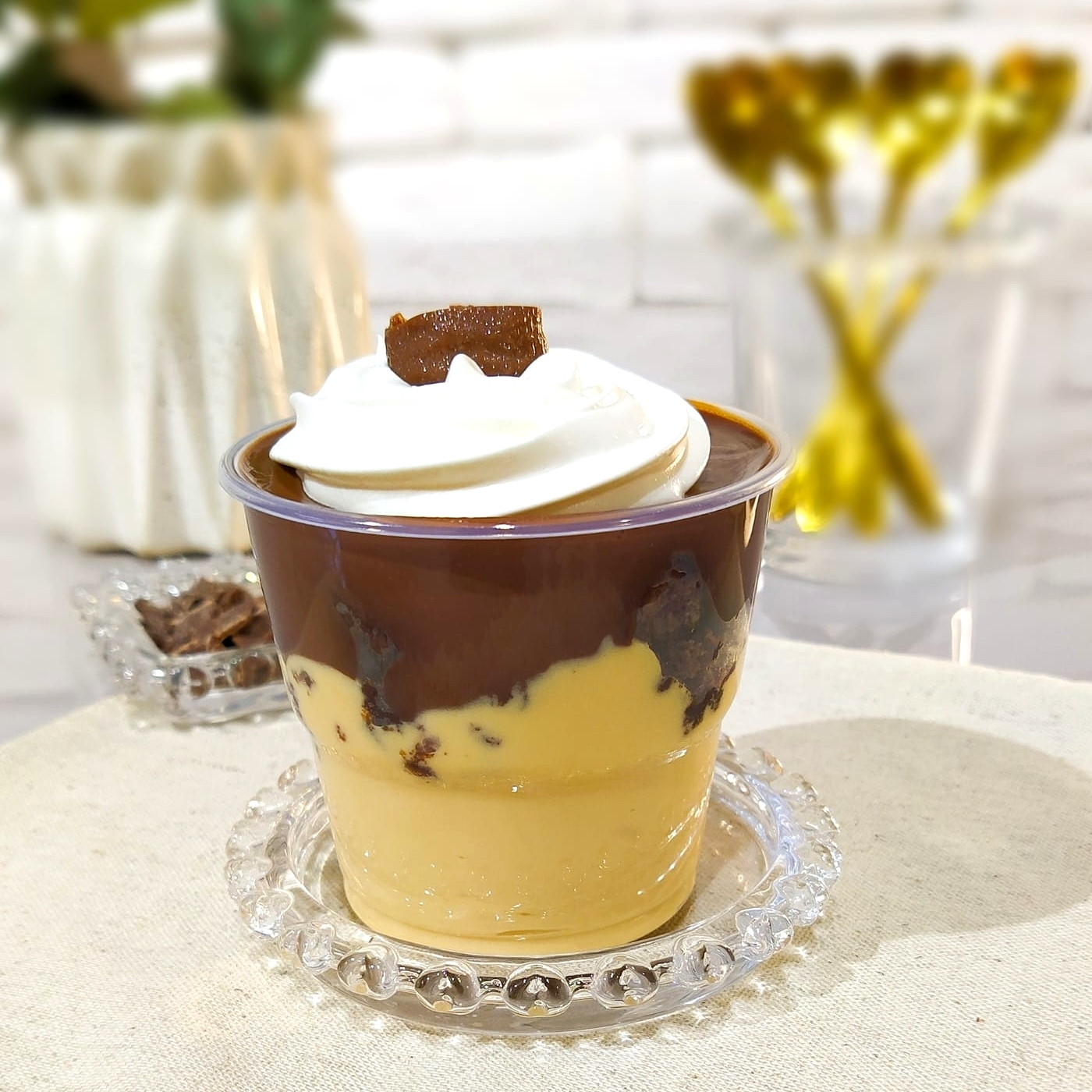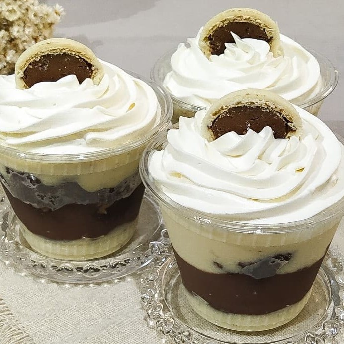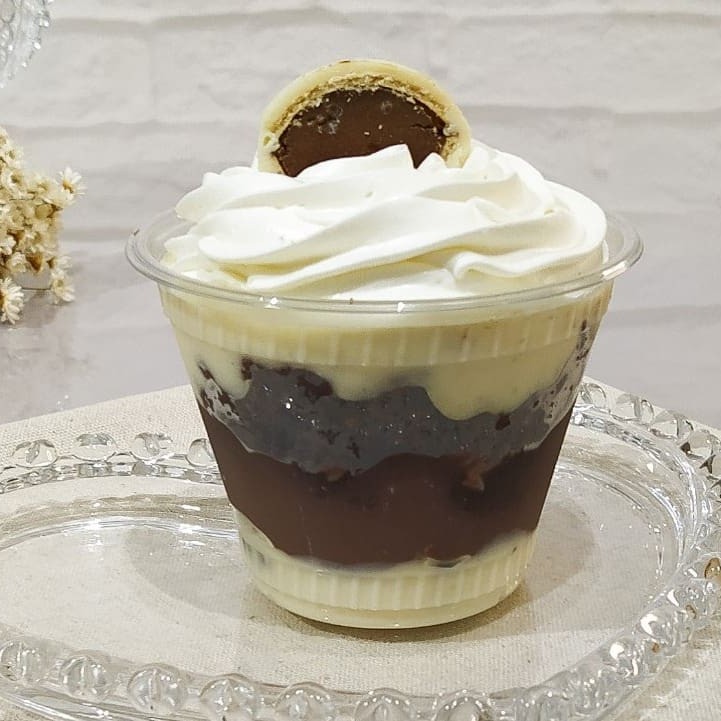 Creme 4 Leites, Bem Leve E Suave, Pedaços De Bombom Ouro Branco Pícado, Creme De Chocolate Meio Amargo, Pedaços De Brownie, Decorado Com Chantininho E Bombom Ouro Branco Picado.