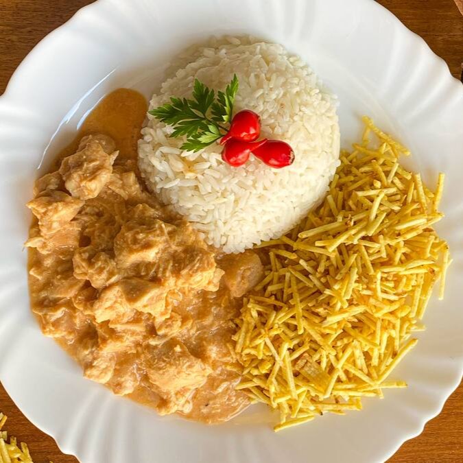Arroz Branco, Strogonoff de Frango (em cubos), Batata Palha.