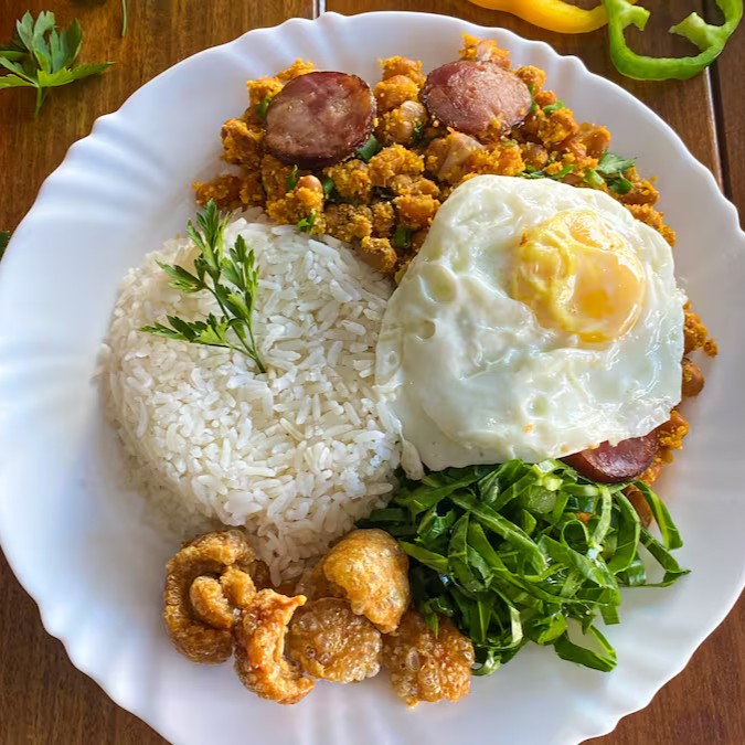 Arroz Branco, Feijão Tropeiro, Couve, Torresmo, 1 Ovo Frito.