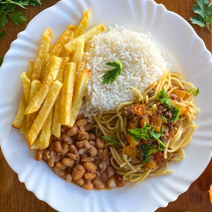 Vegetariano: Arroz Branco, Feijão Carioca, Espaguete Alho e Óleo, Batata Frita e 2 Ovos Fritos.
