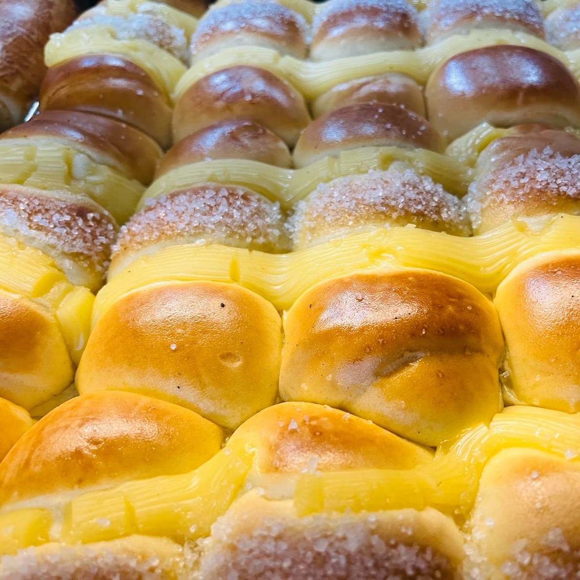 Sabor que é tradição! O Pão Marta Rocha com uma massa de pão doce envolvendo um recheio cremoso, todo finalizado com uma generosa camada de leite condensado e coco em flocos.