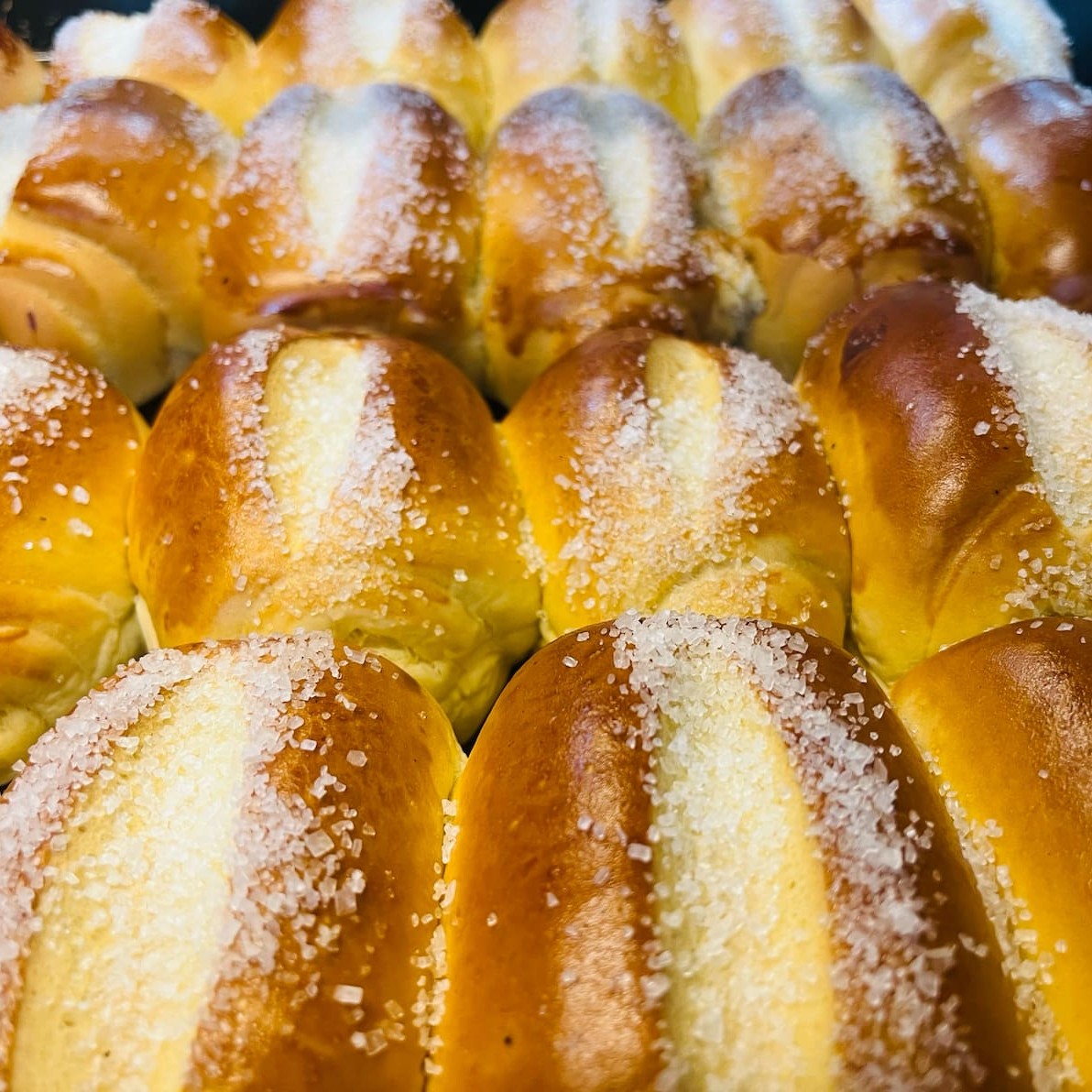 Pão doce com açúcar, um pão feito com massa caseia bem fofa e saborosa, polvilhado açúcar grabulado por cima, realçando o sabor dessa massa deliciosa. Ótimo para qualquer horário do Dia, combina de mais com um cafezinho, ou até mesmo com aquele toddy. Faça agora seu pedido